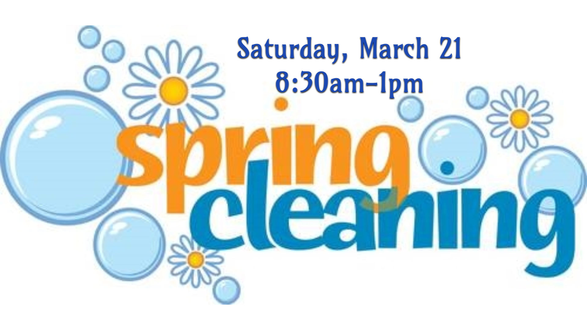 Church Spring Cleaning Day – Saturday, March 21, 8:30am-1:00pm. We will be joining together to give our church home a good top-to-bottom cleaning in preparation for Resurrection Sunday.